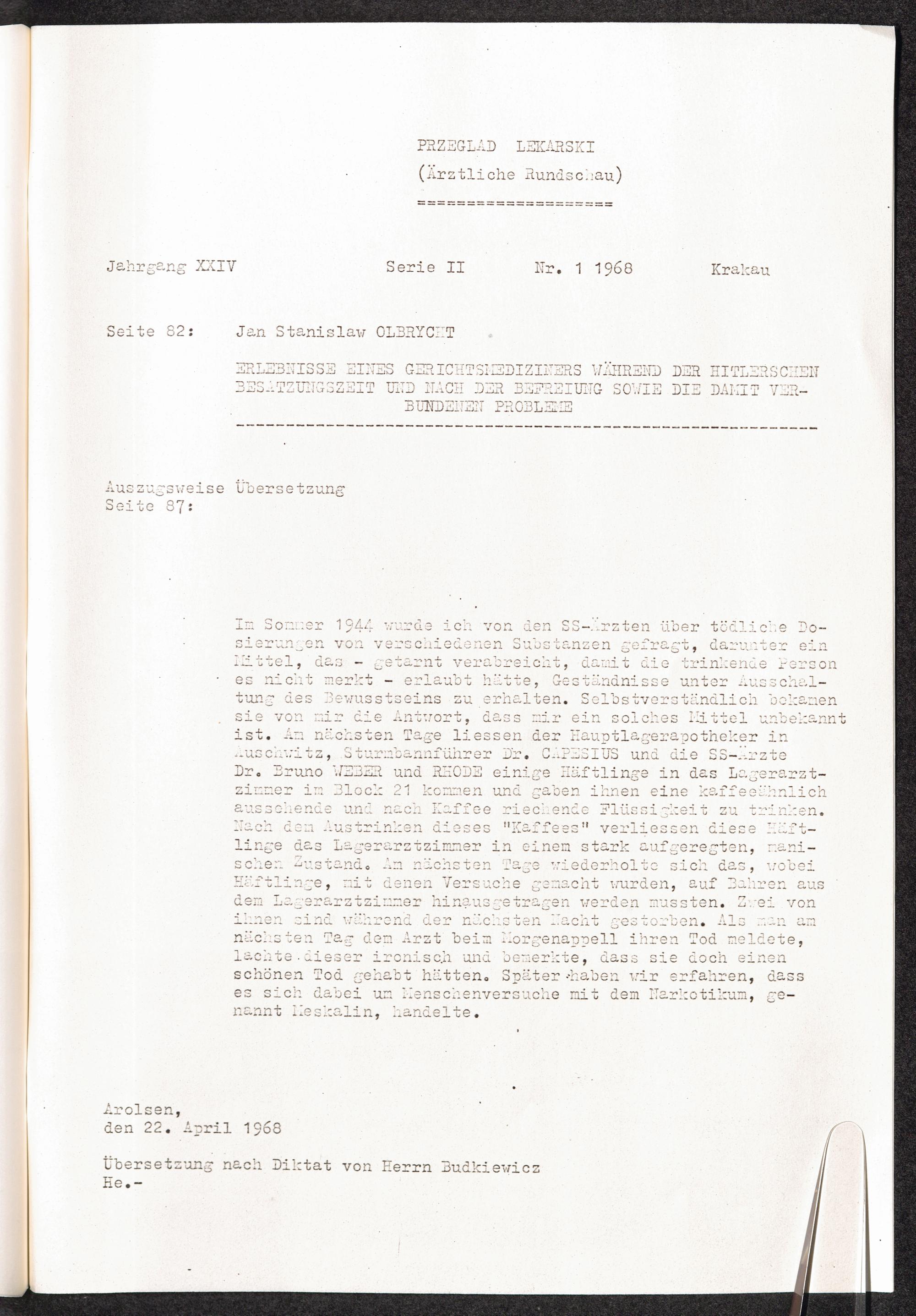 Pseudo-medizinische Versuche im KL Auschwitz [Przegląd Lekarski Nr. 1 1968 ... Auszugsweise Übersetzung]