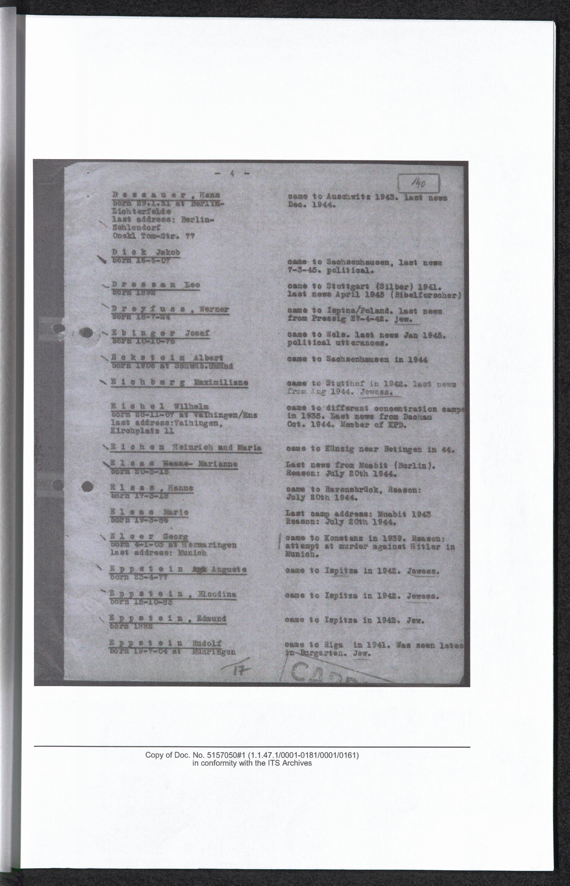 Auswahlbibliografie zu Georg Elser / International Tracing Service