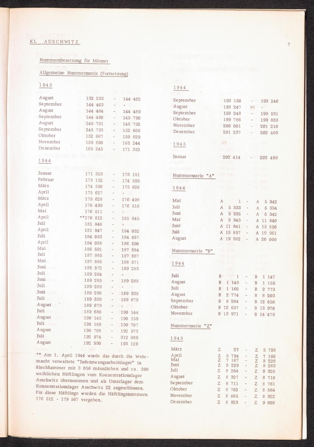 Häftlingsnummernzuteilung in Konzentrationslagern (mit Ergänzungen) KL Auschwitz