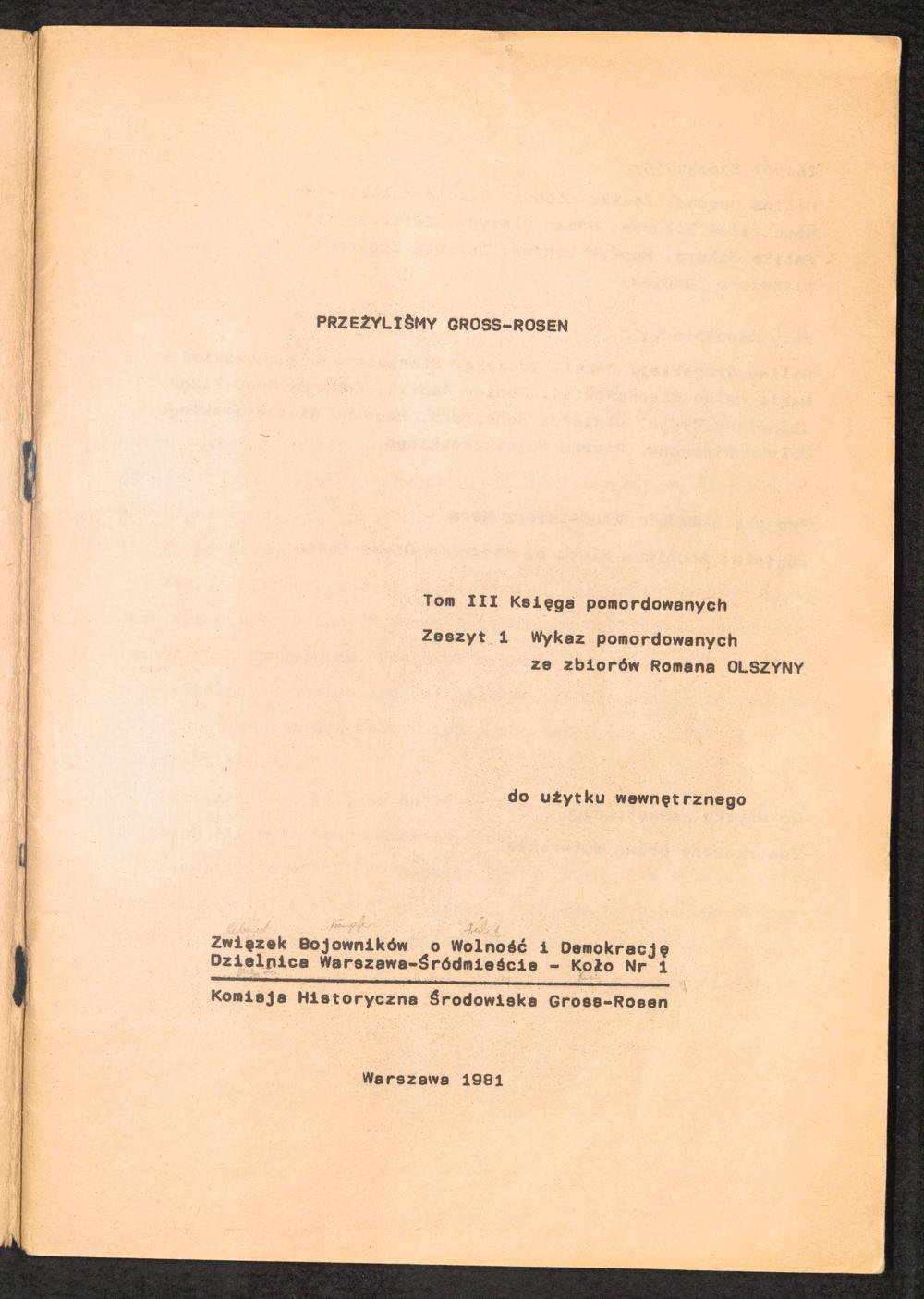 1981: Przezylismy Gross Rosen Tom III, Ksiega pomordowanych, Zeszyt 1 : Wykaz pomordowanych ze zbiorow Romana Olszyny