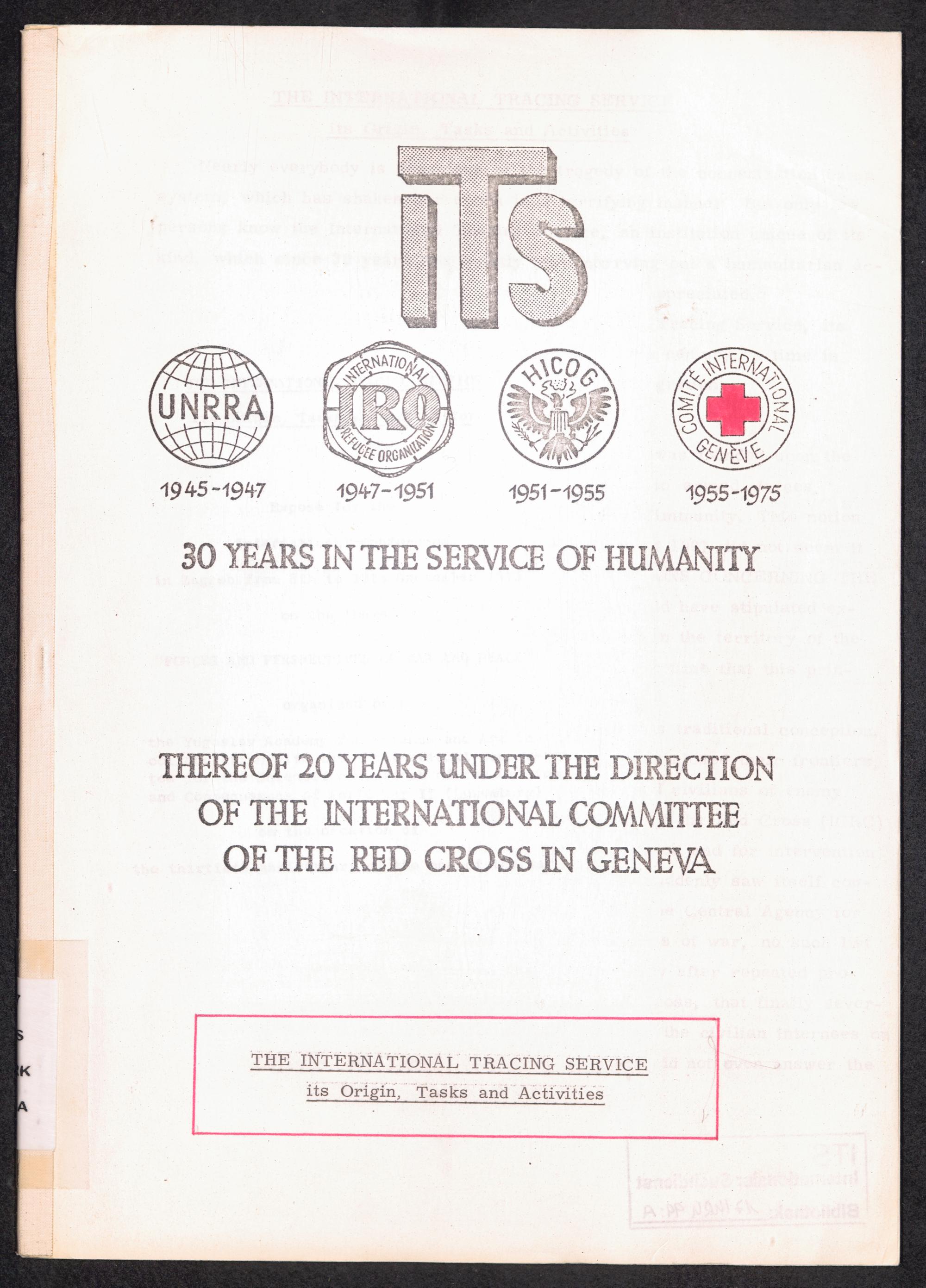 The International Tracing Service : Its origin, tasks and activities - 30 years in the service of humanity. Therof 20 years under the direction of the International Committe of the Red Cross in Geneva