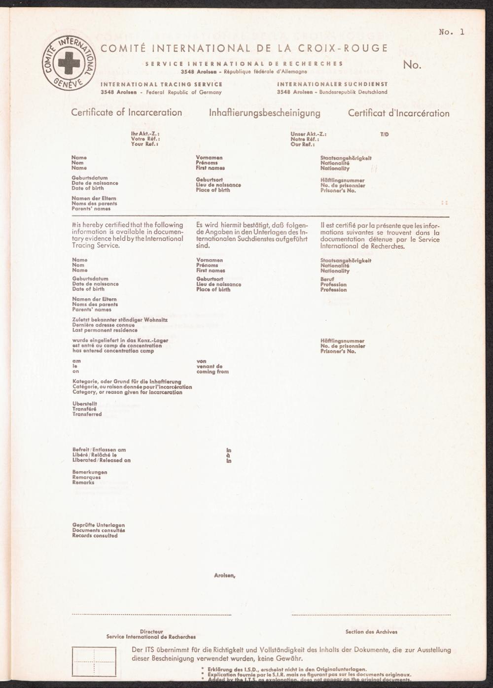 Der Internationale Suchdienst in Arolsen (1945 - 1965) No. 1 Inhaftierungsbescheinigung (Beispiel)