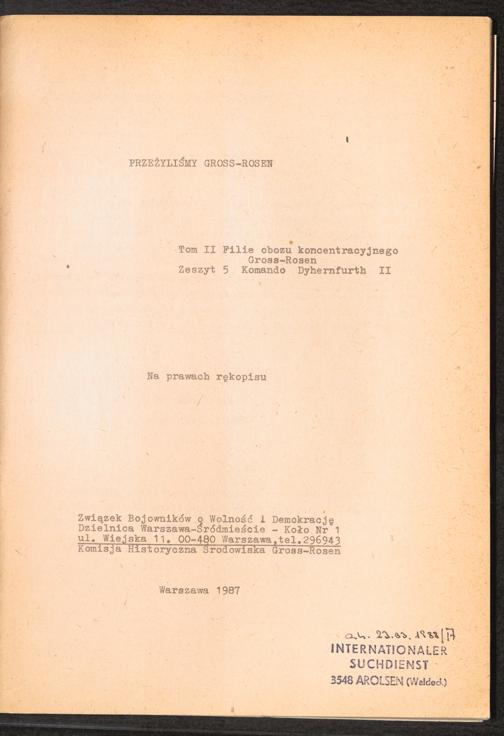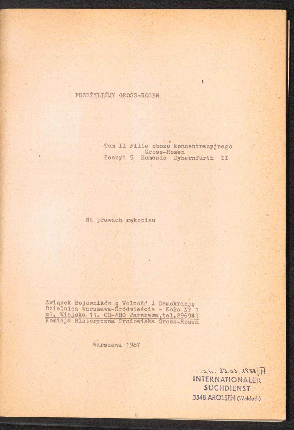 1987: Przezylismy Gross Rosen Tom II, Filie obozu kocentracyjnego Gross-Rosen, Zeszyt 5 : Kommando Dyhernfurth II